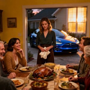 The Tesla looked like it had pulled into the wrong life. Metallic blue against my mom’s cracked concrete driveway, it glittered in the…
