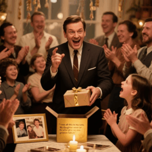 The navy blue box looked heavier than it was because of the way I held it—square at my waist, ribbon catching the chandelier…