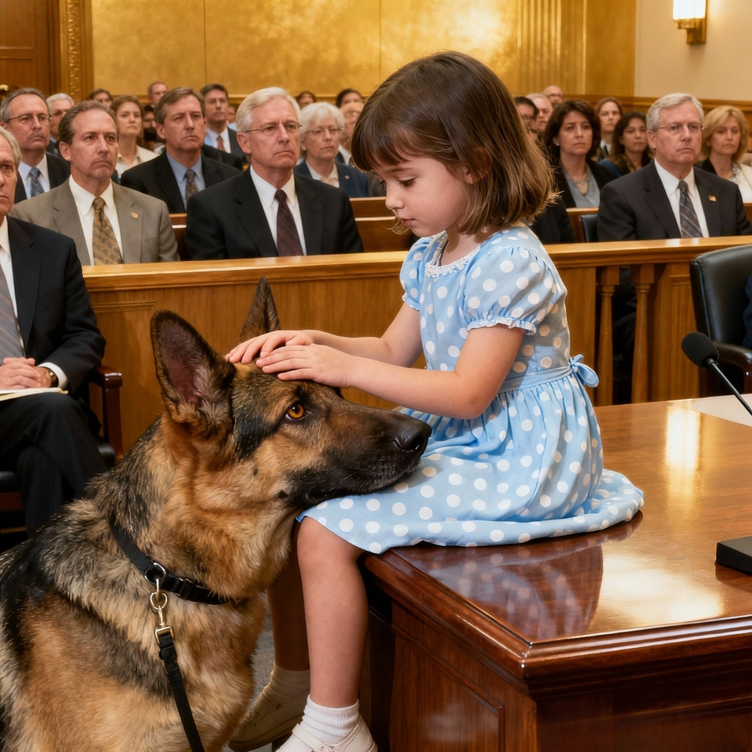 The first sound was not the gavel. It was the hush—the fast, collective inhale a Detroit courtroom takes when a three-year-old in a pale blue polka-dot dress steps through double doors and walks straight into the middle of the United States justice system. Reporters in the back held their breath. Cameras blinked awake behind glass partitions. The Michigan state seal watched from hardwood like an old witness with a long memory. On the carpet, a German shepherd in a certified K-9 therapy vest sat, steady as a lighthouse, and the little girl—Lily—curled into his fur as if it were the only safe thing in America.