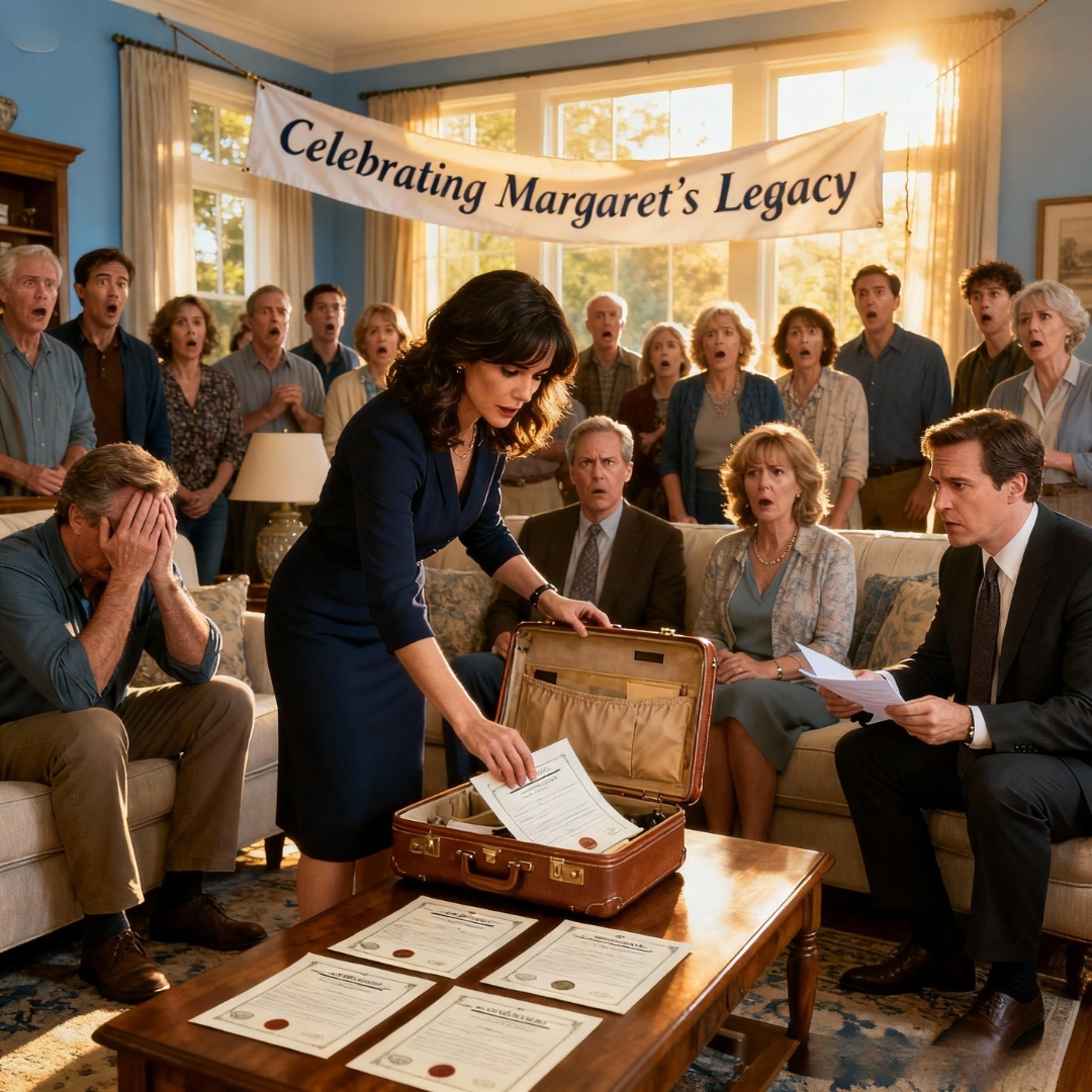The room shifted. Chairs scraped. Glasses clinked. Under the crooked banner—Celebrating Margaret’s Legacy—the house in La Mesa felt like a stage: white tents in the yard, glossy brochures on coffee tables, shrimp cocktail sweating in silver trays. I turned to Mr. Hollis, the family lawyer who’d been practicing estate law since before I could spell it, and gave him the sentence that froze the room.