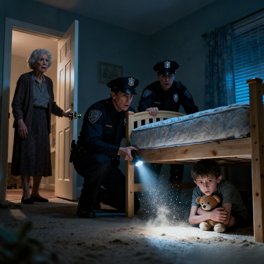 Within minutes, red and blue lights painted the quiet street. Two police officers—one older, one barely out of the academy—stepped through the door. I led them upstairs, my voice barely a whisper. “It’s in there. Under the bed.”