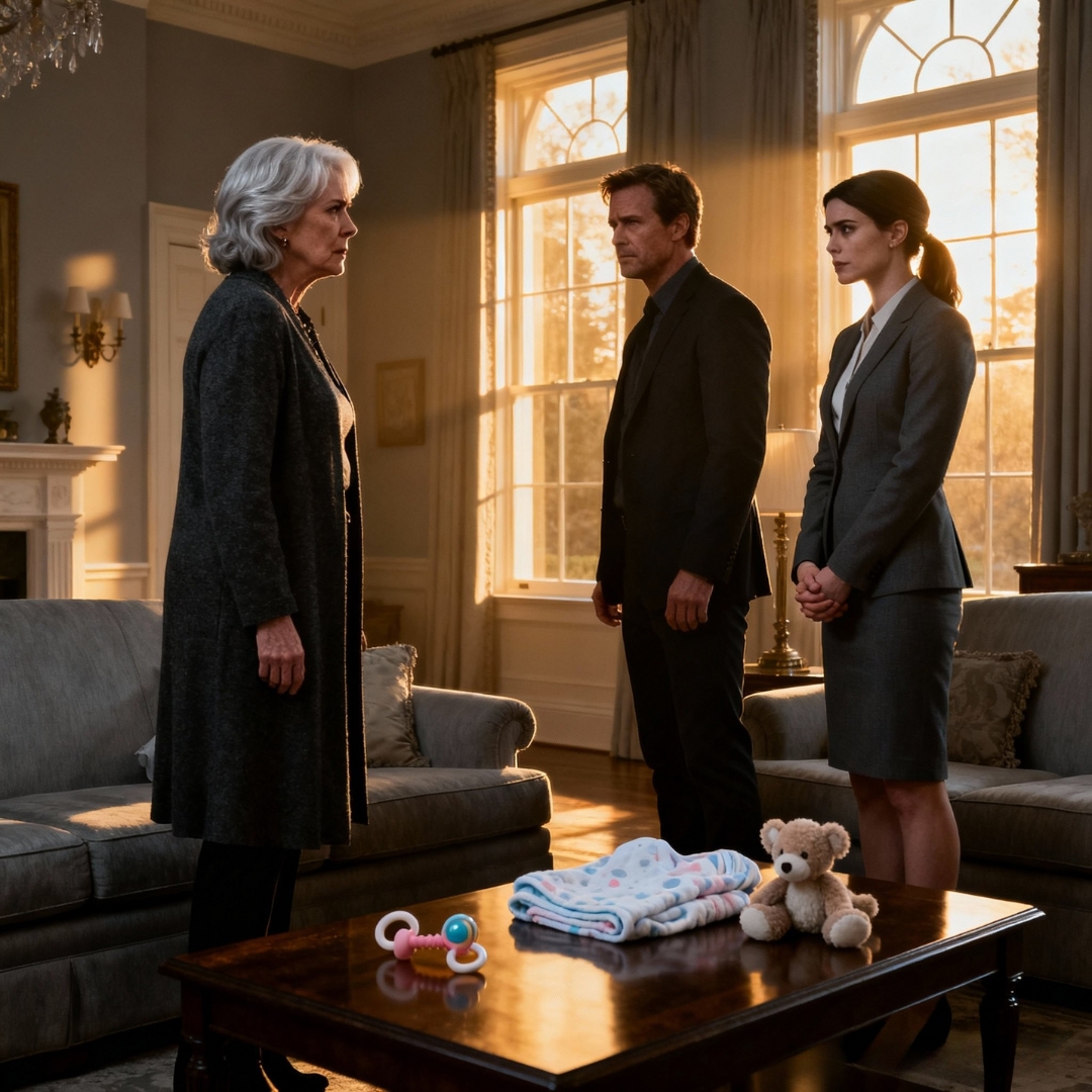 I set a silver rattle and a cashmere blanket on the formal settee in a room built to impress, not to hold a newborn. Vanessa sat beside Christopher, linen and a silk blouse, no spit‑up, no soft exhaustion. Elegant silence where a baby should be.