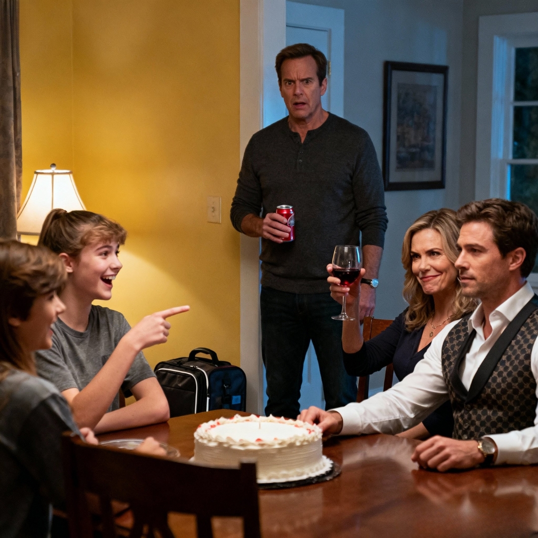 The birthday candle snapped in half like a tiny bone—one sharp crack, a hiss of sugared smoke, and twenty staring eyes reflecting the American flag bunting Lisa had hung across our suburban dining room “for ambiance.” The Pinot in their glasses looked like stage blood under the bulb. My daughter’s phone camera hovered at chin height, ready to turn my life into content. “You’re a nobody,” Madison announced, pearly nails tapping her screen as her friends smirked. “You fix toilets. You think that makes you a man?”