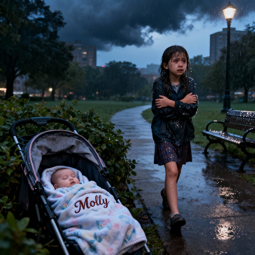 Rain clung to his eyelashes. His sneakers squelched with every step. The stroller’s tiny wheels bumped over the cracked path, leaving twin tracks on the soaked asphalt. Inside, wrapped in a pink blanket with the name “Molly” stitched in looping letters, a newborn baby wailed like her heart was breaking.
