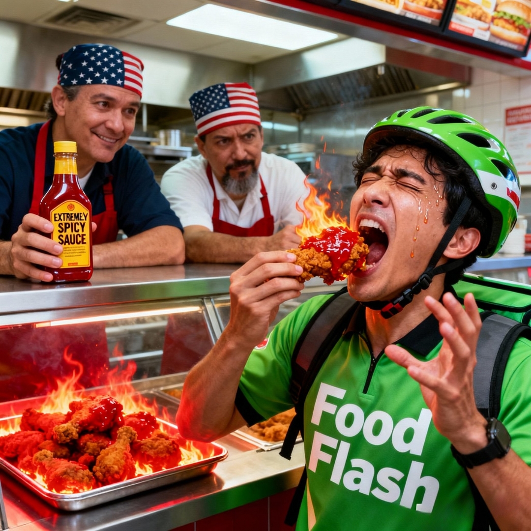 “Food Flash,” he said hoarsely when Gino opened the door. “You order hot chicken?”