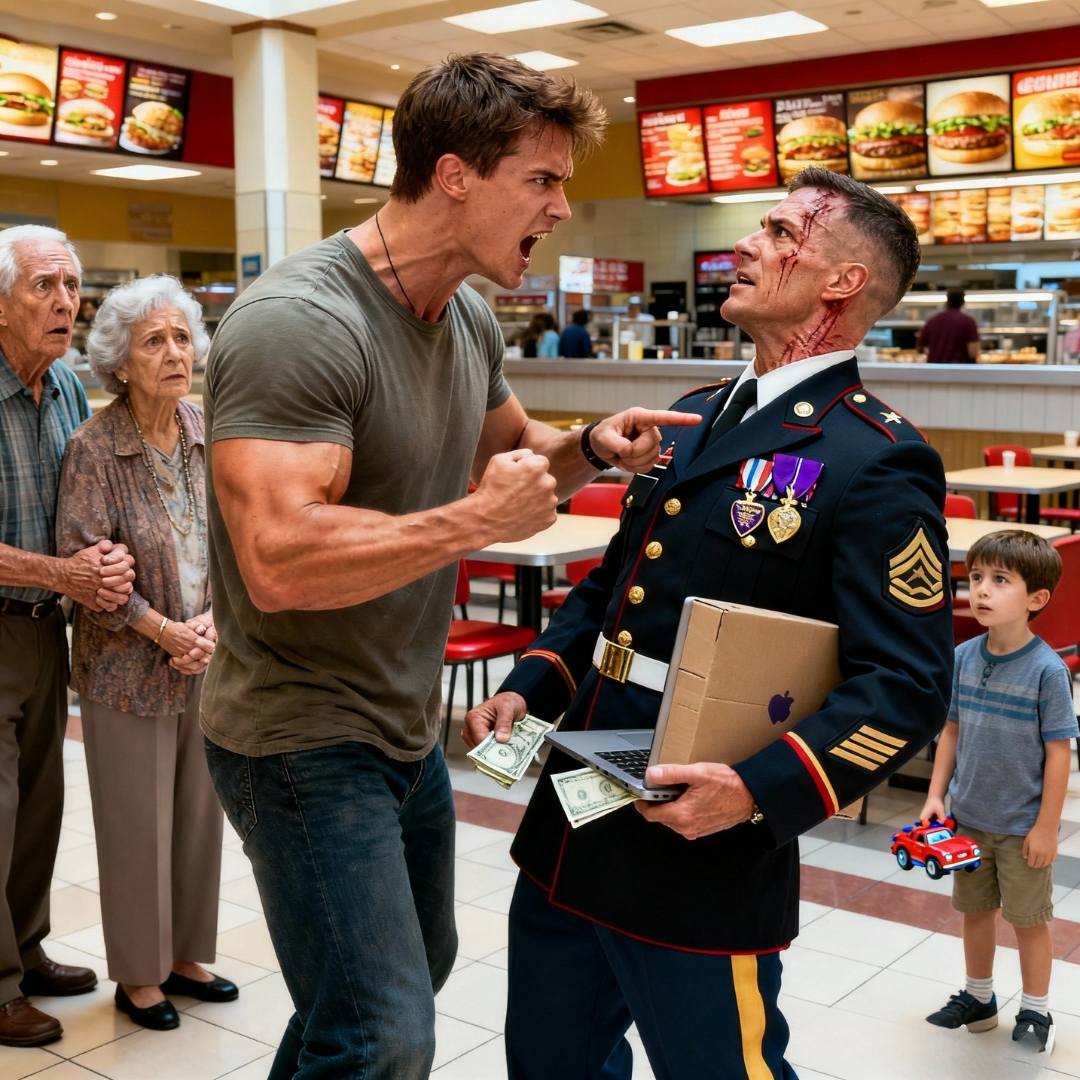 The “soldier” had gone up to the counter of the burger place again, leaning casually against it, fiddling with his phone. He looked relaxed. Confident. Like someone who knew the world owed him something.