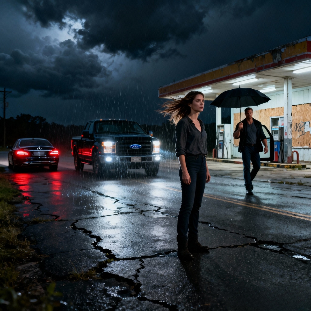 Rain hammered the windshield as he pulled us onto the access road, headlights cutting through the darkness.