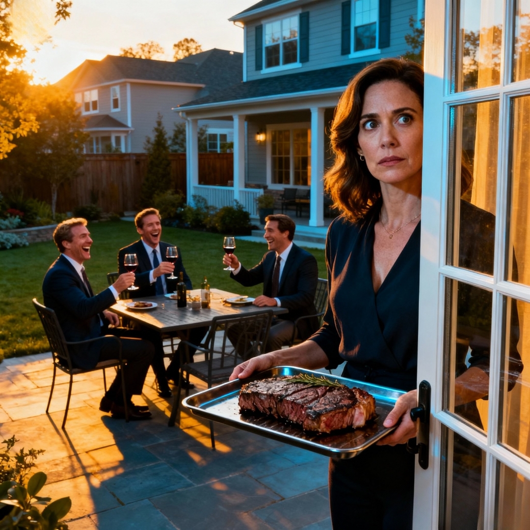 I stood outside the French doors with a tray of steaks still hissing from the grill, the scent of rosemary and garlic curling into the evening air. On the other side of the glass, Nathan actually pushed up from my Restoration Hardware chair to clap Dominic on the back like he’d said something brave.