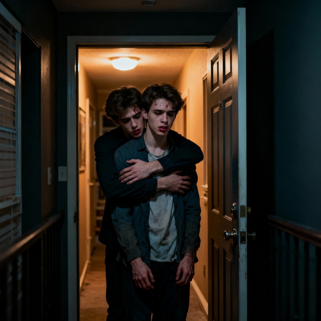 When I opened the door and saw my twin brother standing there—swollen lip, split eyebrow, hands shaking so hard he could barely keep them at his sides—something in me went perfectly still.