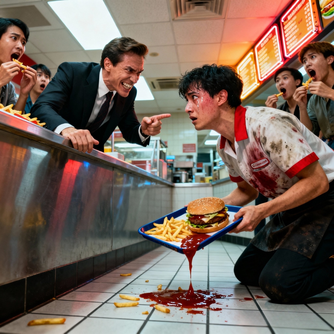 He sauntered away laughing, leaving Larry staring at the mess that would take ten minutes to scrub and weeks to forget.