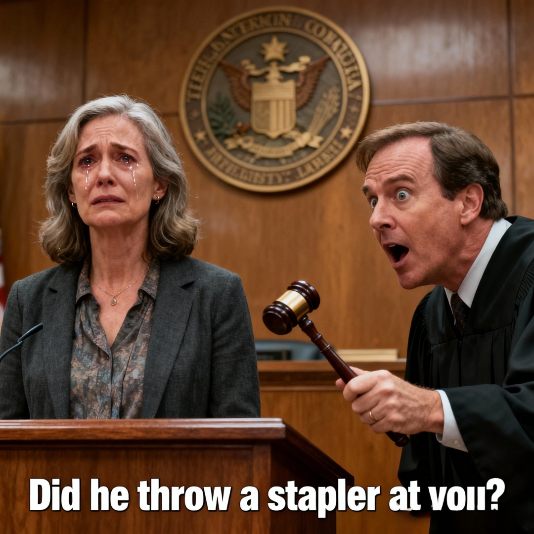 “I’m sorry,” the judge said slowly. “My hearing’s not what it used to be. Did you say he threw a stapler at you?”