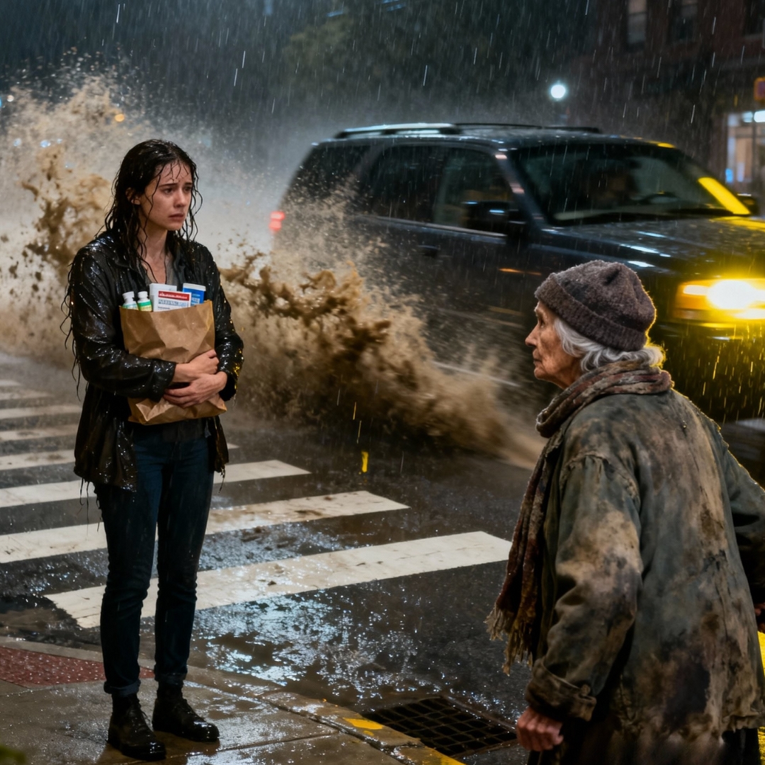 Rain hammered the blacktop so hard the headlights of passing cars smeared into long gold streaks, like someone had dragged a wet brush across a gray canvas. The wind came in sharp bursts, slapping through my thrift-store jacket like it was tissue paper. My jeans were soaked to the knees. My fingers were stiff and red around the crumpled brown paper bag I held against my chest like it was made of glass.
