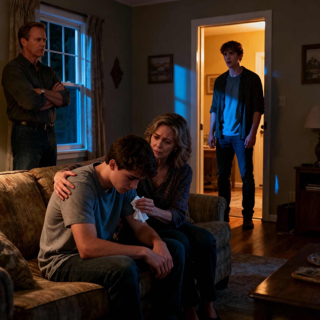 Kyle sat on the couch, head bowed, shoulders slumped, the picture of remorse. It was a pose I’d seen my whole childhood whenever he got caught doing something wrong. Mom hovered over him, rubbing his back, handing him tissues. Dad stood by the window, arms crossed, gaze fixed anywhere but on me.