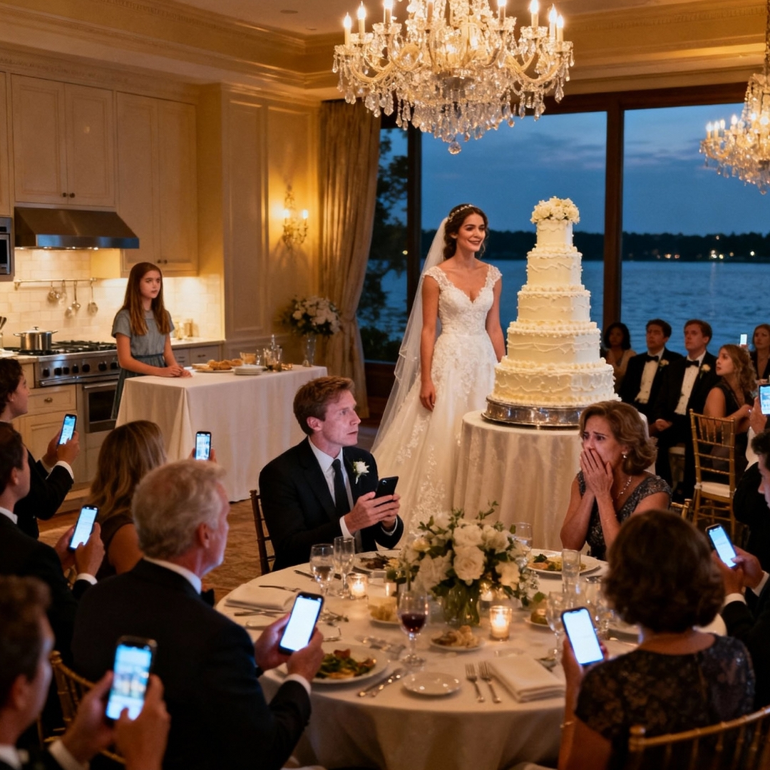 Emily hadn’t noticed yet. She was next to the cake with her bridesmaids, head thrown back in laughter, veil trailing behind her like a magazine spread. But she could sense something. After a minute, she stopped laughing and frowned, looking around.