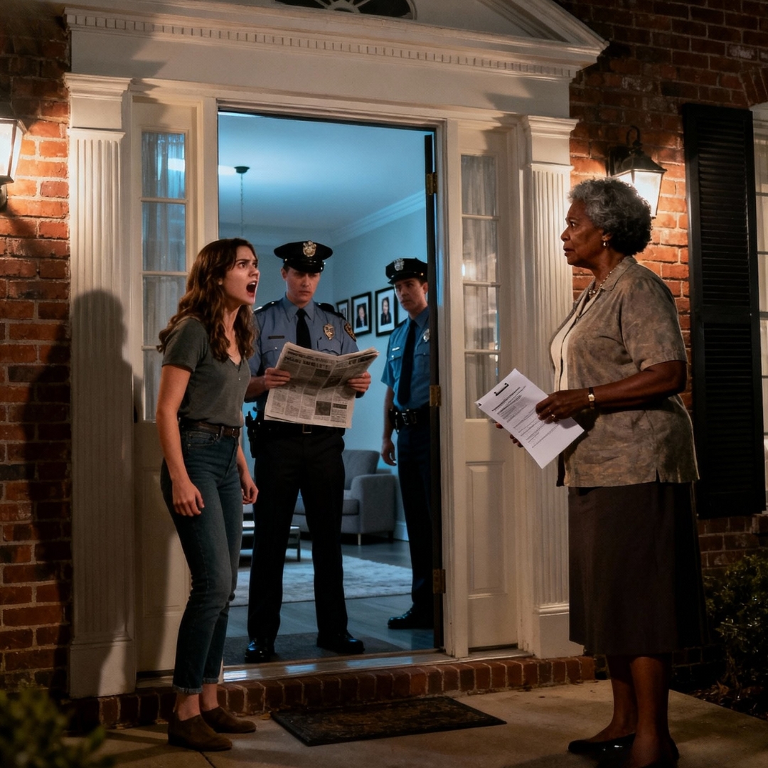I stood on the front porch of the brick colonial I grew up in, deed in one hand, memories in the other, watching officers walk up the same steps where my grandmother once shelled peas and my son took his first-day-of-school photos.