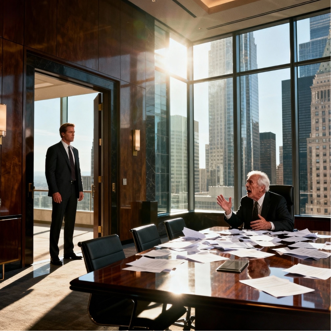 But as I walked toward the boardroom, the scene looked like a crime scene someone had forgotten to tape off. Papers scattered across the corridor. A half-spilled coffee on a console table. The boardroom door, usually closed with military precision, stood half-open, listing on its hinges like the room itself was exhausted.