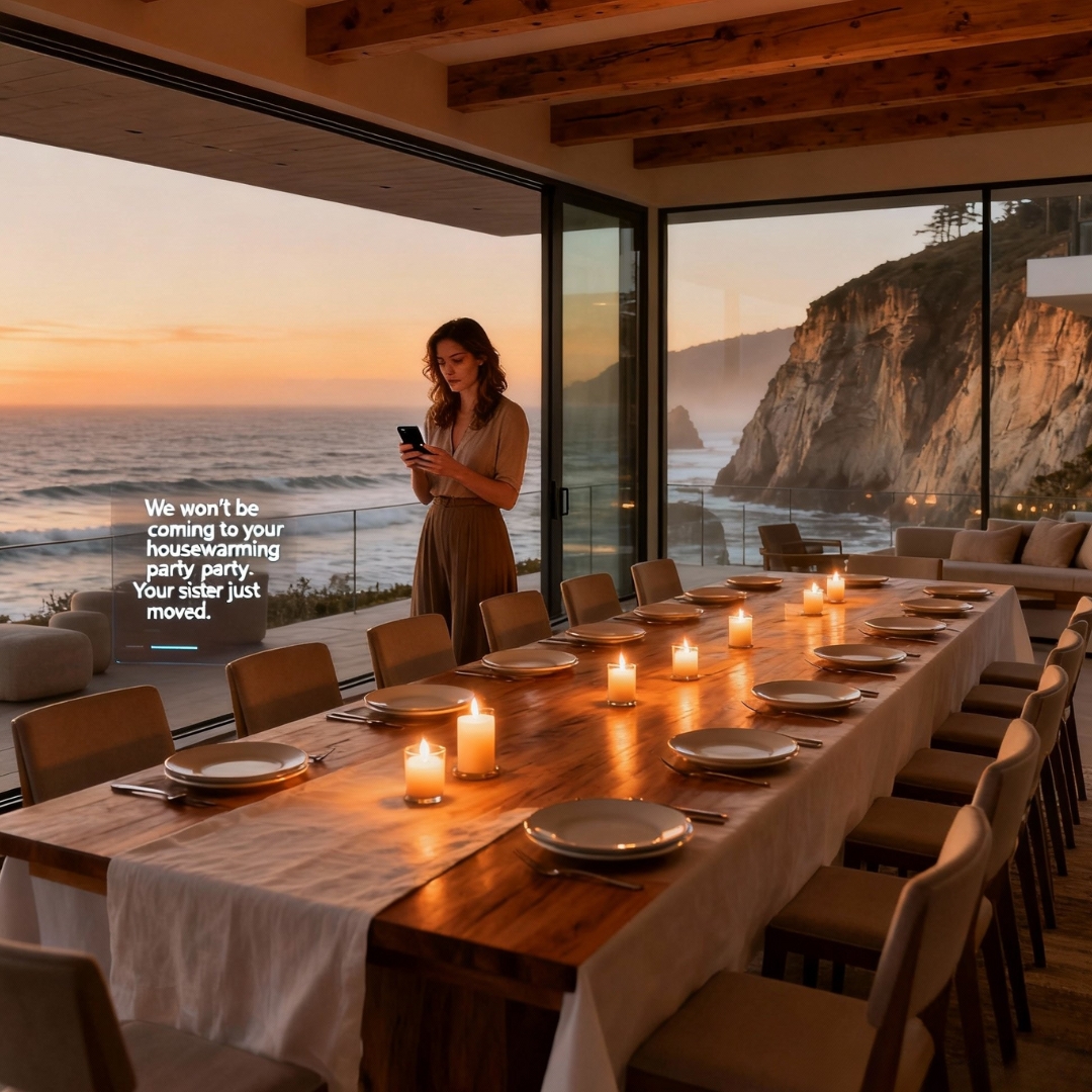 The text came on a Thursday afternoon while the marine layer hung low over the cliffs and the sea outside my floor-to-ceiling windows was restless, dark blue bruised with white caps. I was at the stone kitchen island, finalizing delivery notes for the caterer. Sixteen guests. Two vegetarian. No peanuts. Enough wine to soften three decades of awkwardness.