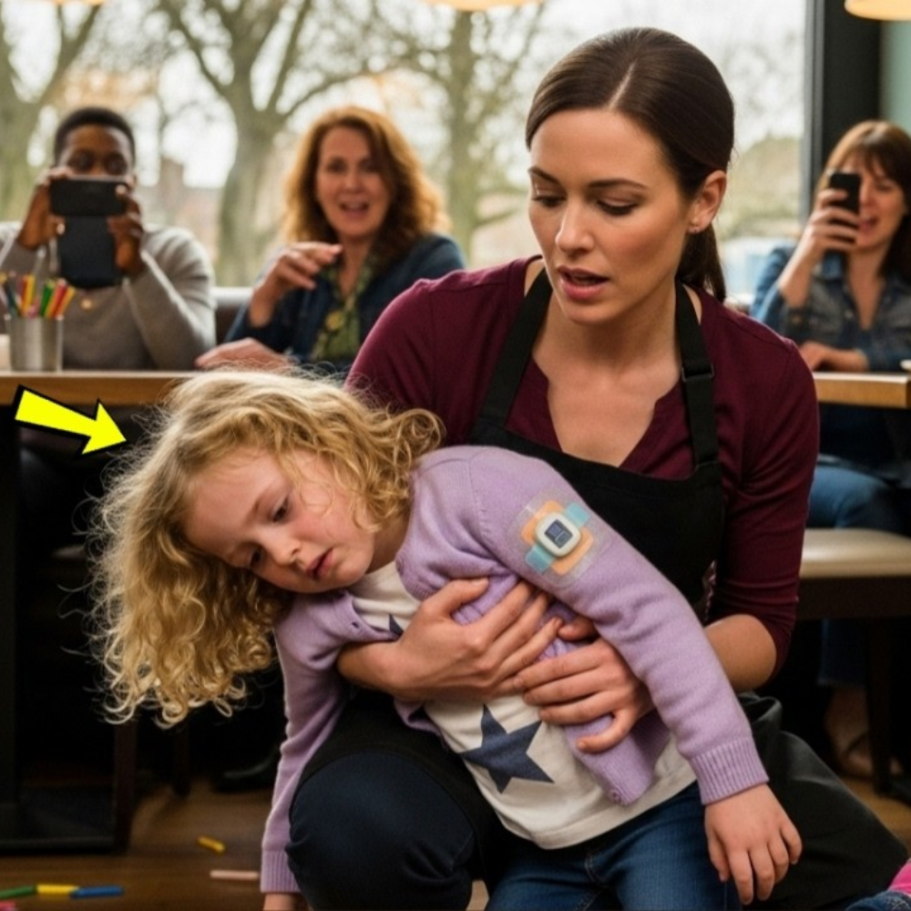 The alarm on the little girl’s wrist went from a polite chirp to a siren that chopped the hum of Riverside Café clean in two. A purple crayon rolled off the table and hit the wood floor with a sound that, later, everyone in the room would insist was louder than it had any right to be. Rachel Hayes was already moving—knees hitting the planks, apron knot biting her spine, the smell of dark roast and caramel syrup floating uselessly around her—by the time the child said, in a breath that wasn’t quite a voice, “Miss Rachel, I don’t feel good.”