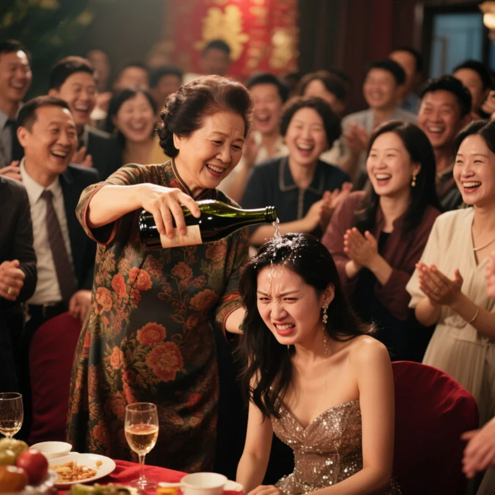 Elena felt the liquid tighten the fabric, clinging cold and sticky to her skin. The music faltered then limped on, quieter, unsure. A champagne flute slipped from someone’s hand nearby and shattered on the marble floor.