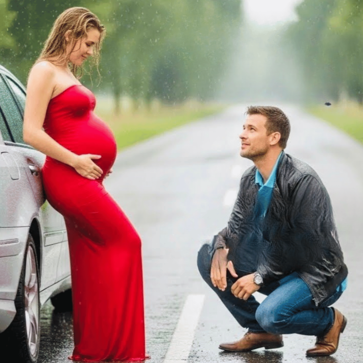 His knuckles were pale against the steering wheel when the emergency blinkers finally broke through the rain. A silver Mercedes sat angled on the shoulder of Industrial Boulevard, hood up, a soft bloom of steam curling into the wet. Beside it stood a woman, pregnant—visibly, precariously—one hand braced against her belly, the other holding a phone that clearly wasn’t helping.