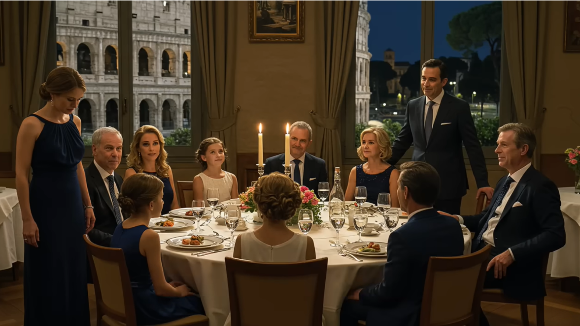 Not pushed in. Not stolen. Not late to arrive from a back room. Simply absent—like I’d been erased from the picture and nobody bothered to retouch the edges. The rooftop air in Rome tasted of cold metal and citrus, a flawless view of the Colosseum burning gold against the dusk. Crystal stemware winked. A violinist slid into the first notes of something expensive and forgettable. Twelve chairs hugged a perfect round table. Mine, the thirteenth, did not exist.