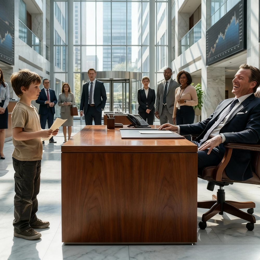 The receptionist hesitated, fingers hovering above her keyboard. Her gaze dropped to his shoes, then his hoodie, then the ID around his neck. Somewhere behind her, a stock ticker scrolled red and green.