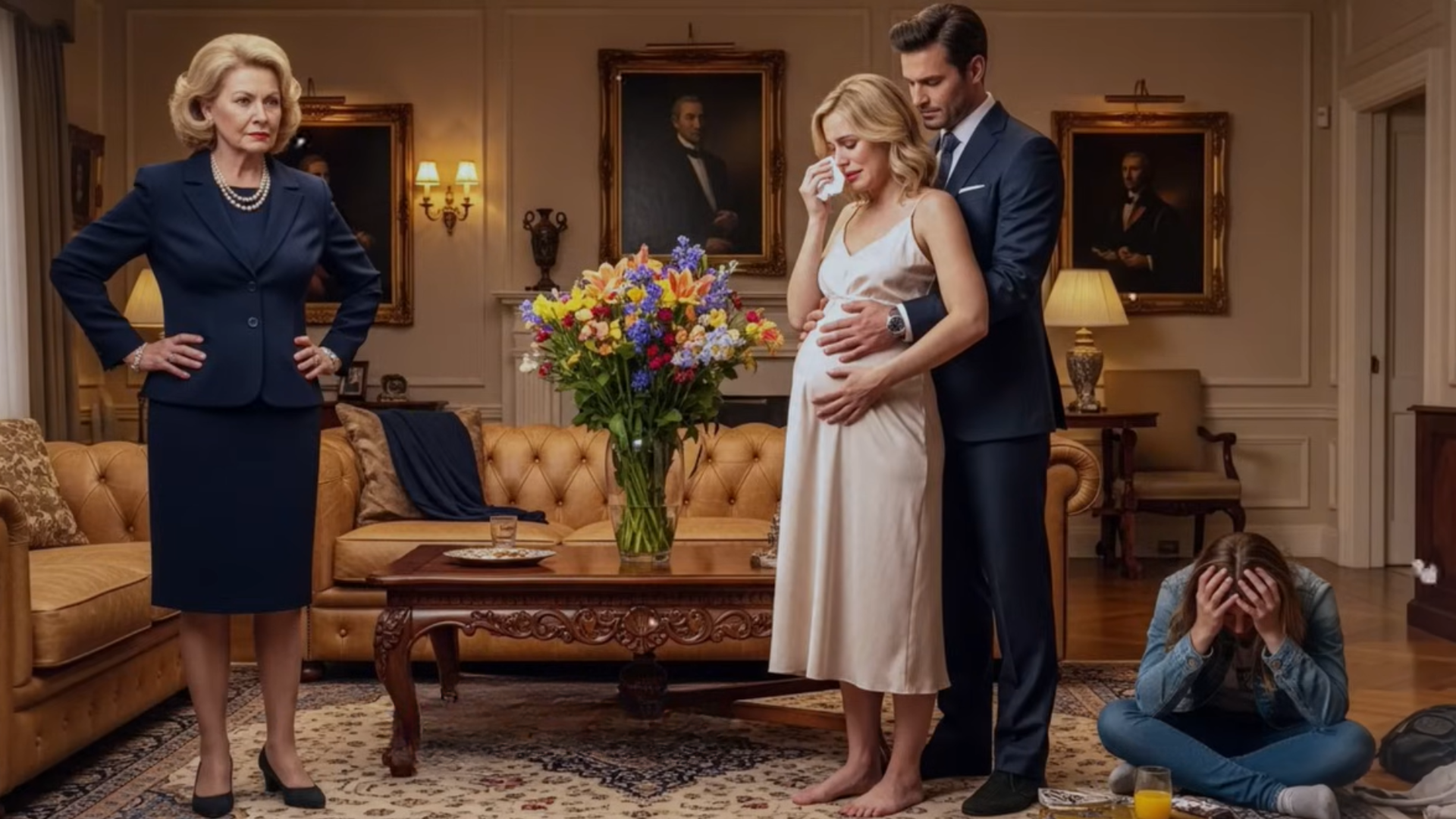 Mrs. Eleanor Thornton stood above me, her diamond bracelet glittering as cruelly as her eyes. The matriarch of the Thornton dynasty—sharp cheekbones, flawless hair sprayed into armor—looked at me as if I were something that had crawled up from the gutter. Behind her, Jim Thornton, my husband of three years, stood motionless in his tailored charcoal suit, the picture of Manhattan wealth and moral decay. His gaze avoided mine; guilt trembled at the corner of his lips.