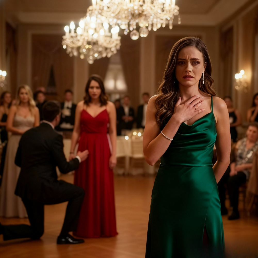 The diamond flashed like a gunshot under the ballroom chandeliers, and two hundred champagne flutes froze mid-air as my husband sank to one knee—not for me.