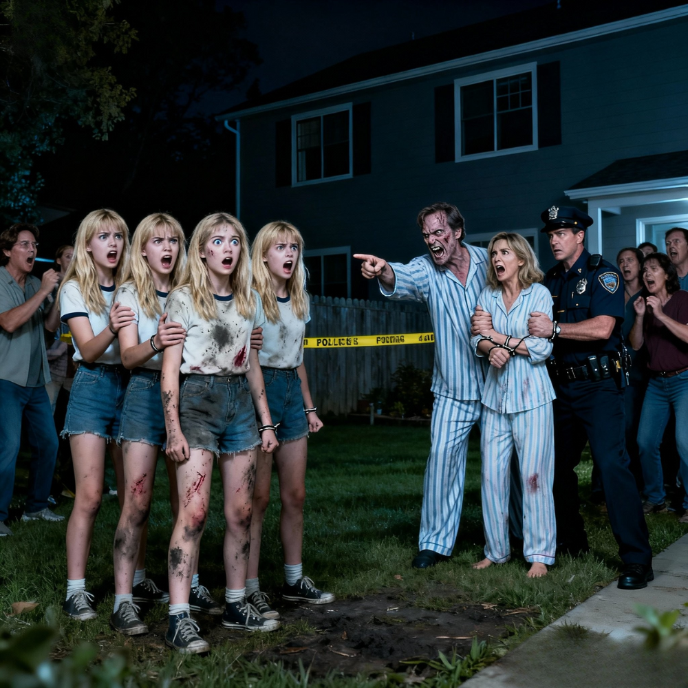 Mr. Dunn didn’t look convinced. He’d lived next to us for years, watching my parents wave from the driveway, host backyard cookouts, drive the girls to Little League games and school concerts. He’d also seen the triplets stand in his yard and talk about a fourth sister. He’d heard fragments of late-night conversations when the windows were open. His gaze moved from Mom’s tight smile to our four faces lined up in the yard—three in matching pajamas, one in an oversized T-shirt, dust still in her hair, small cuts on her arms.