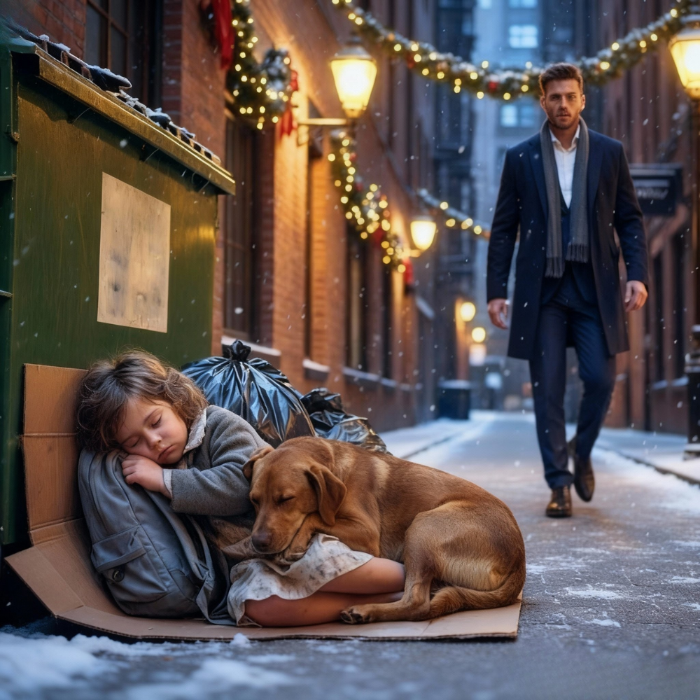 A little girl lay curled on a flattened refrigerator box beside an overflowing dumpster, her small body hidden inside an oversized hoodie that smelled of damp and street smoke. The hoodie had once been pink. Now it was the color of the alley: gray, stained, tired. Snowflakes landed on her tangled hair and didn’t melt right away; her skin was that cold.
