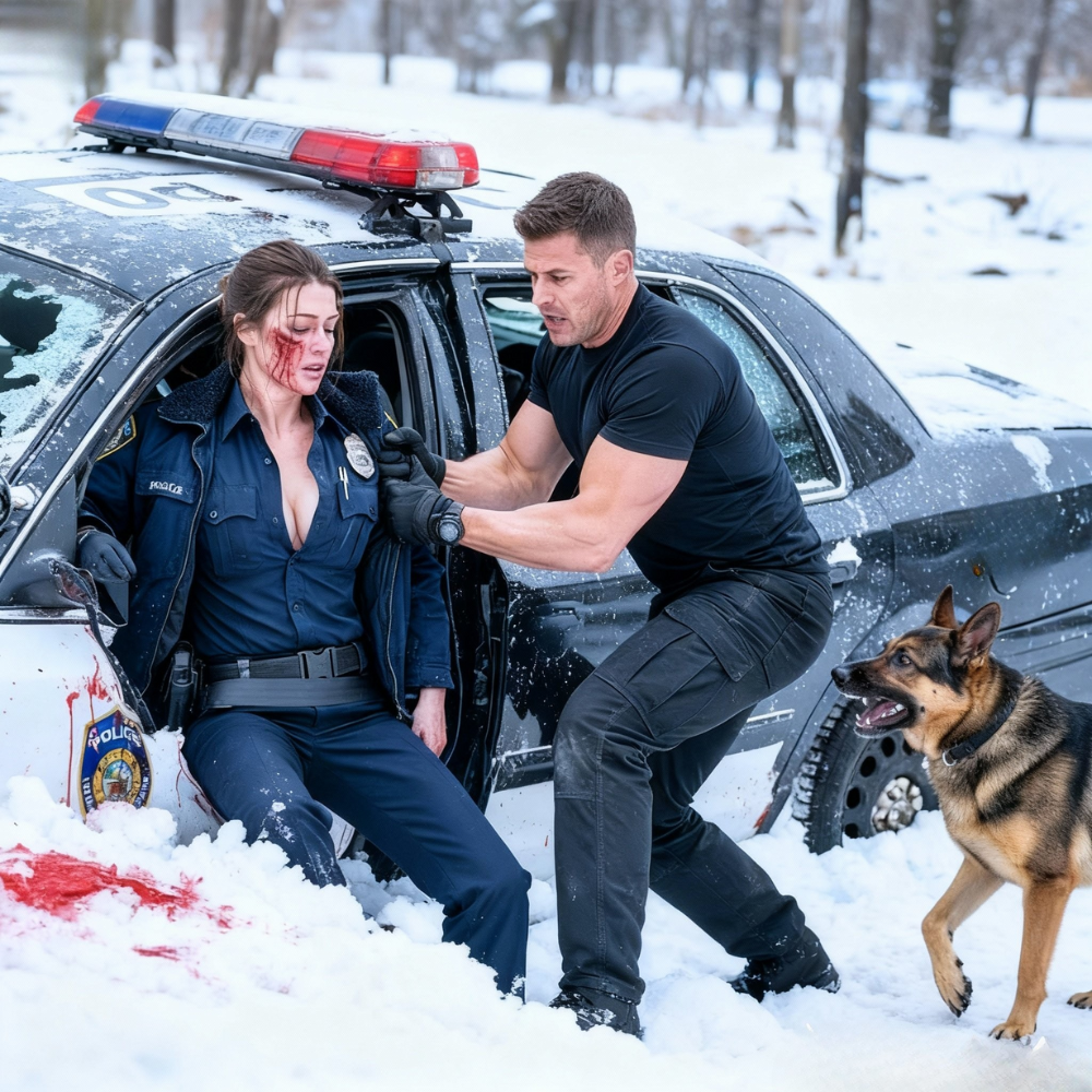 He sprinted the last few yards, dropping to his knees beside the dog. His gloved hands plunged into the snow, pushing it aside, frozen crystals biting his skin even through the wool. The beam of his flashlight cut through the flurries, tracing the smooth, familiar curve of a police cruiser’s roof, then the shattered side windows, the twisted light bar, the dented door.