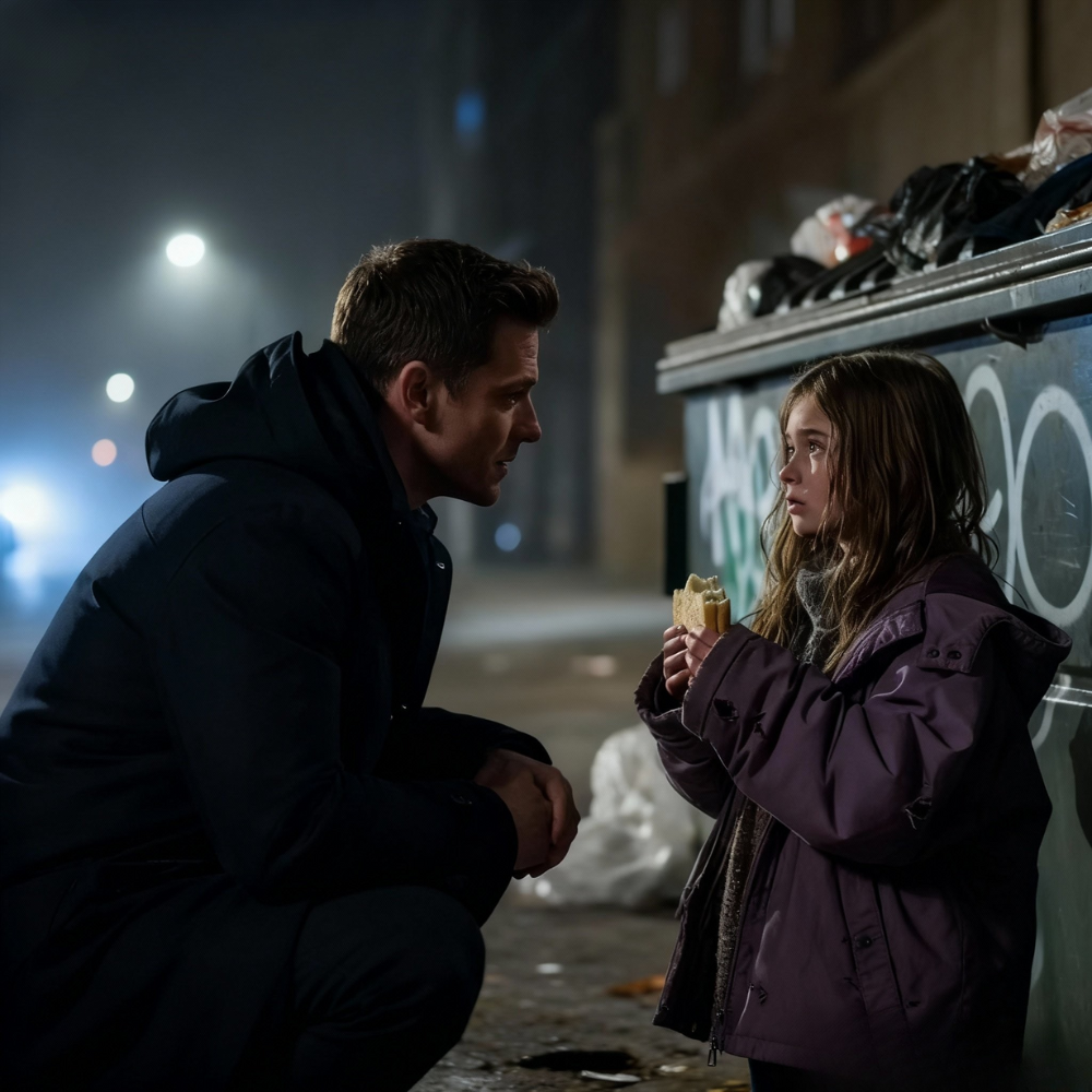 The girl’s head snapped up. Big brown eyes locked on him—eyes too old for the face they were sitting in. For a heartbeat, they were just two shapes in the alley: a grown man heading to work, a kid in the trash.