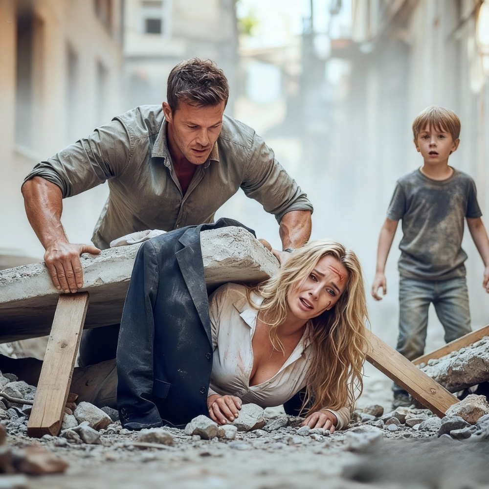 The woman pinned under the concrete blinked through the haze, lashes clumped with grit. A slab from the building’s façade had sheared off in the quake and landed across her shin at an angle no human limb was meant to bend. Her blazer—black, slim-cut, expensive in a way Ethan could recognize but never afford—was torn at the shoulder. Blood seeped through the fabric and onto the sidewalk, spreading towards his knee.