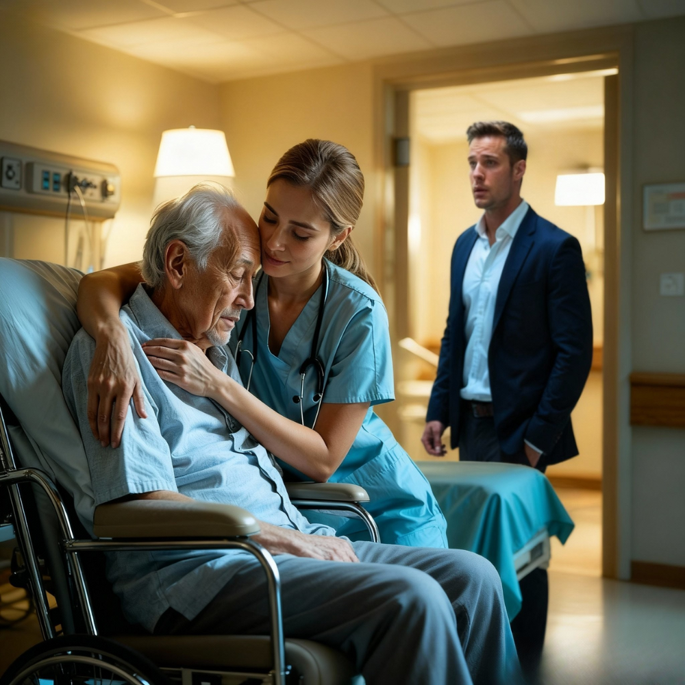 Mr. Raymond lay motionless in the bed closest to the window. Late seventies, maybe early eighties, with thick silver hair combed neatly back and deep grooves carved from his temples to his chin. His skin had the papery pallor of someone who’d spent too much time indoors. His eyes were open but unfocused, a washed-out gray that didn’t seem to land on anything— not the ceiling, not the IV bag, not the nurse who had just left, not the young woman now standing at his bedside.