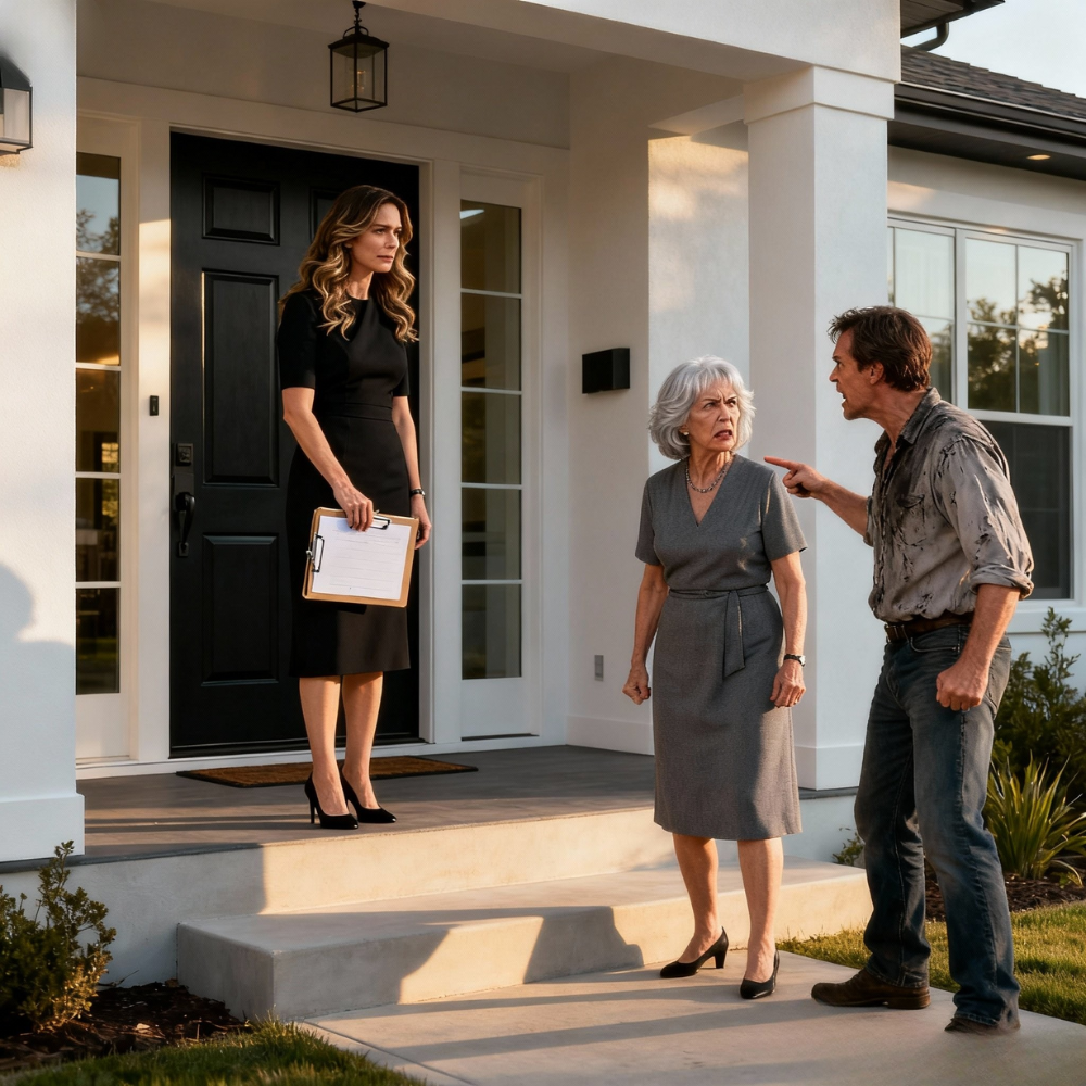 I was standing at the top of the steps in jeans and a worn T-shirt, arms folded. Next to me stood a tall man in a navy suit, polished shoes planted on the weathered boards like he owned them. A badge from the County Office of Property Records was clipped to his belt. Under his arm he carried a thick folder stamped with the name of my trust.